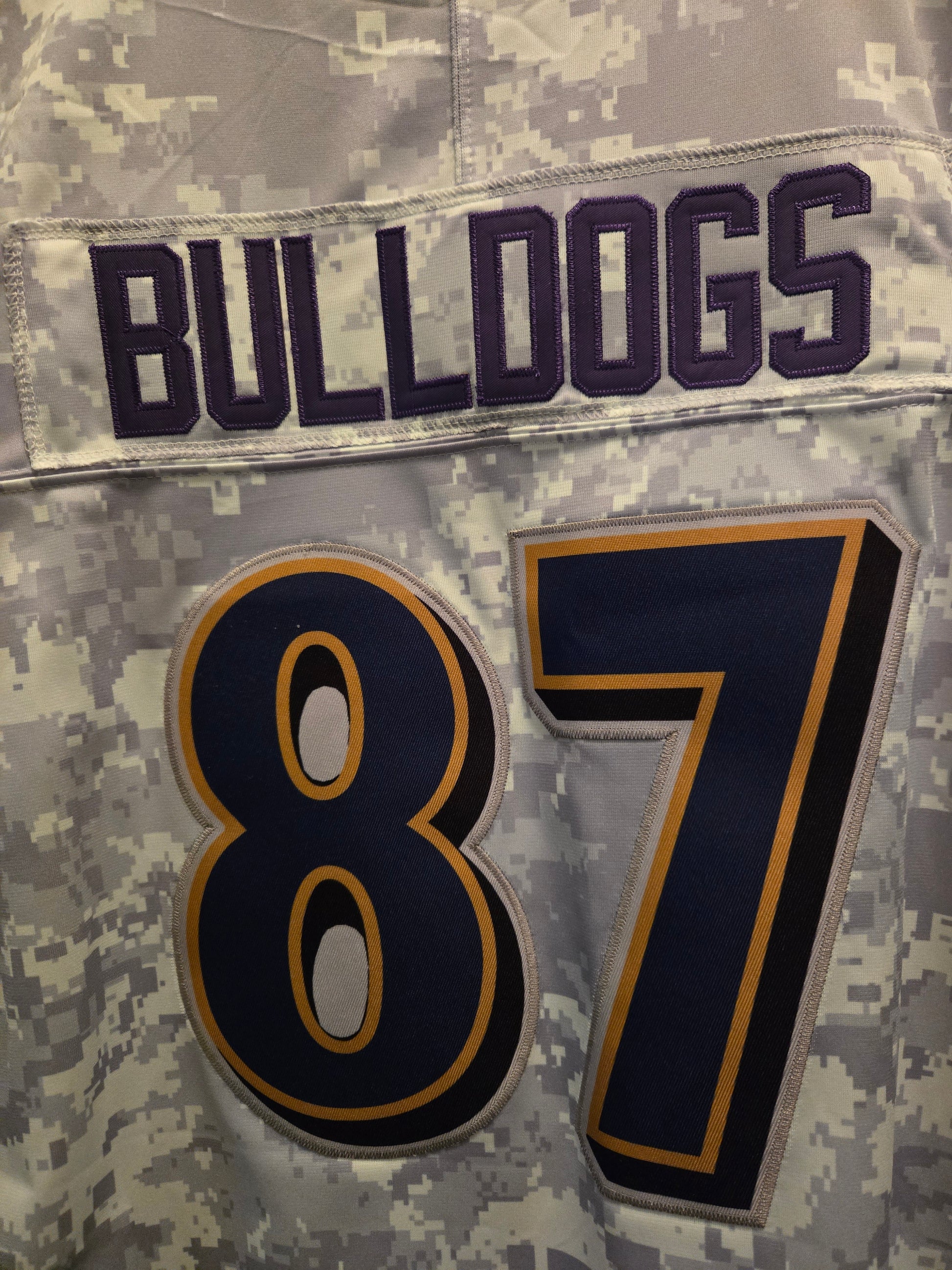 Dieses hochwertige American Football Trikot der Bulldogs in Camouflage-Optik ist ideal für Fans und Spieler. Mit der Nummer 87 auf der Vorder und Rückseite und aus 100% Polyester gefertigt, sorgt es für einen bequemen und atmungsaktiven Tragekomfort. Erhältlich in den Größen XXL.