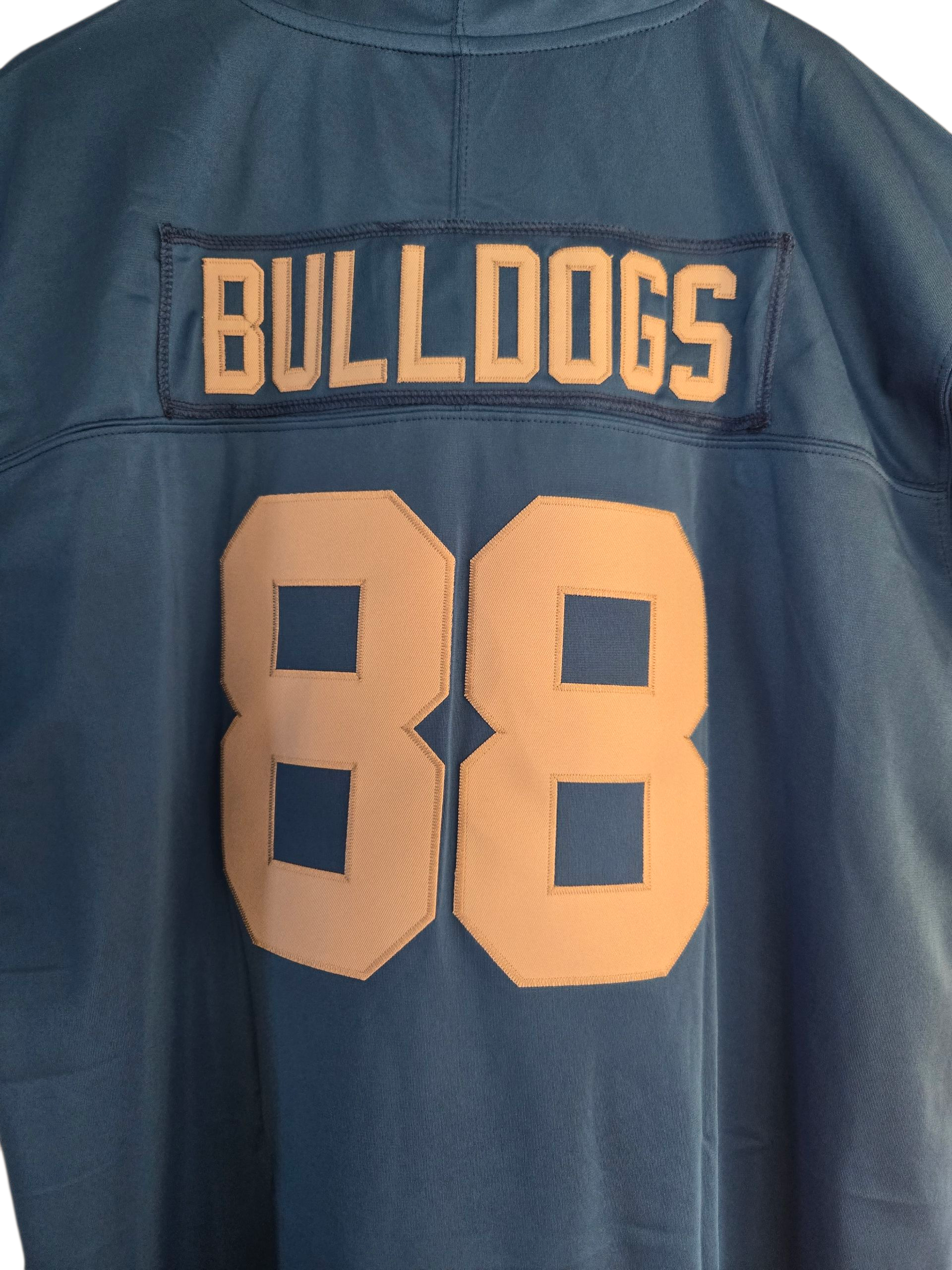 Dieses hochwertige American Football Trikot der Bulldogs in blau grau/weiß ist aus strapazierfähigem Polyester hergestellt. Die Nummer 88 und der Name sind aufgenäht. Mit einer Breite von 66cm und einer Länge von 86cm in Größe XXL und einer Breite von 64cm und einer Länge von 84cm in der Größe XL ist es perfekt für alle Football-Begeisterten.
